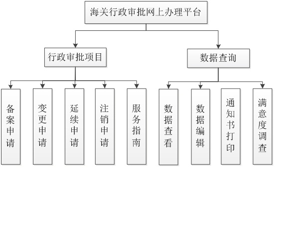 海关行政审批网上办理平台实现12种行政审批事项(报关企业注册登记、暂时进出口货物的核准、出口监管仓库、保税仓库设立审批、免税商店设立审批、海关监管货物仓储审批、常驻机构及非居民长期旅客公私用物品进出境核准、小型船舶往来香港、澳门进行货物运输备案、承运境内海关监管货物的运输企业、车辆注册、获准入境定居旅客安家物品审批、长江驳运船舶转运海关监管的进出口货物审批、保税物流中心(A型)设立审批、保税物流中心(B型)设立审批)的设立、备案、延续、注销申请,包括申请人的用户注册;行政审批数据的录入、修改、删除、查询、保存、提交;附件上传;行政审批通知书打印、满意度调查表填写功能。